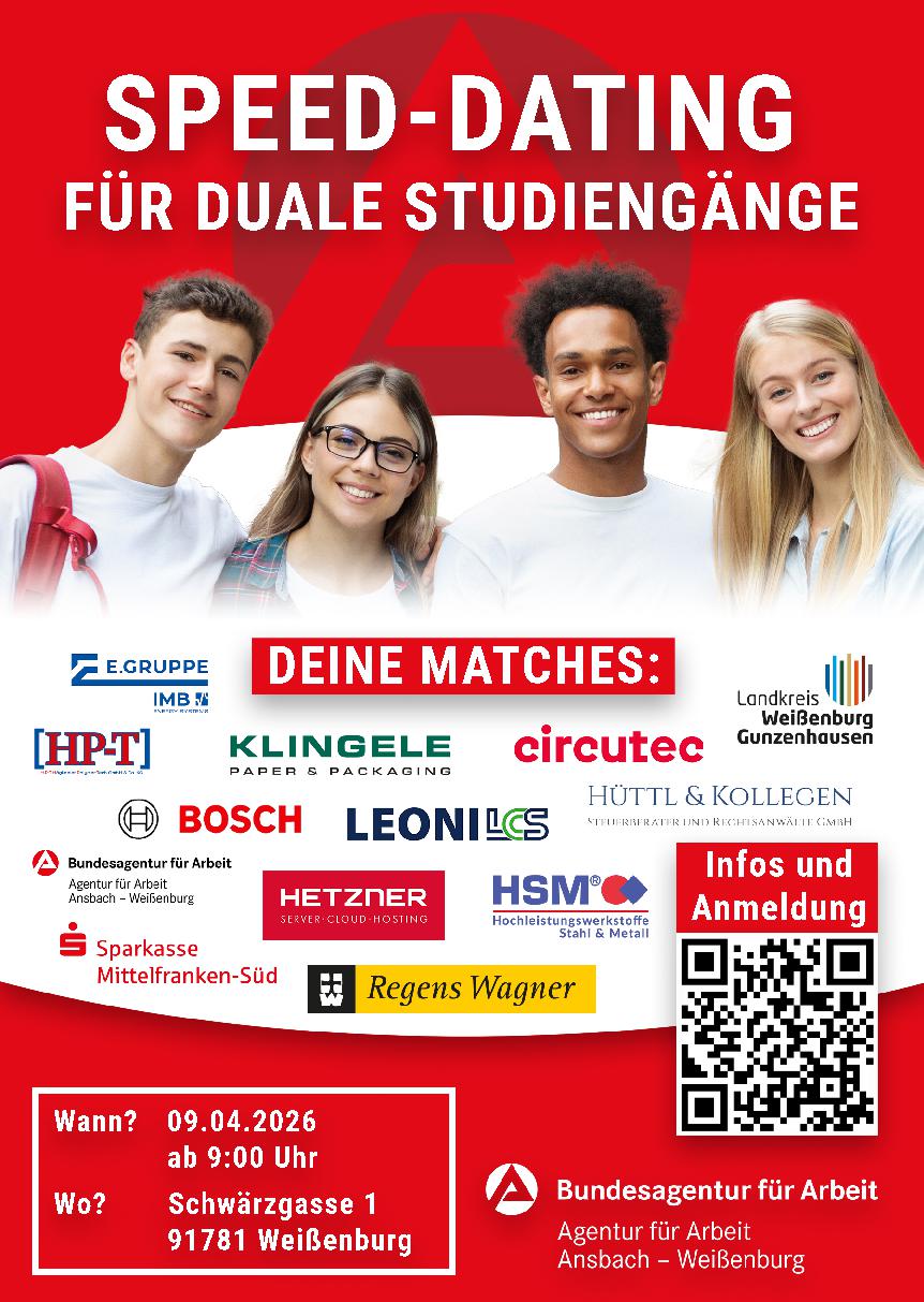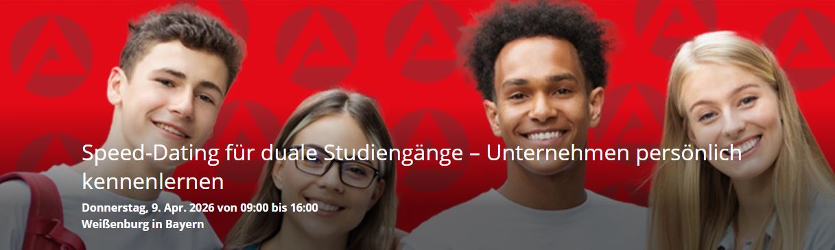 Die Veranstaltung findet in der Agentur für Arbeit Weißenburg statt. Deren Berufsberatung ist vor Ort, begleitet den Prozess und steht für alle Deine offenen Fragen zur Verfügung. Im Idealfall findest Du ein passendes Match und gehst mit einem konkreten Studienvorschlag und klaren Vorstellungen für Deinen weiteren Weg nach Hause. Die teilnehmenden Unternehmen sind in allen Gesprächsblöcken identisch. Eine Anmeldung ist jeweils nur für einen Zeitblock möglich.