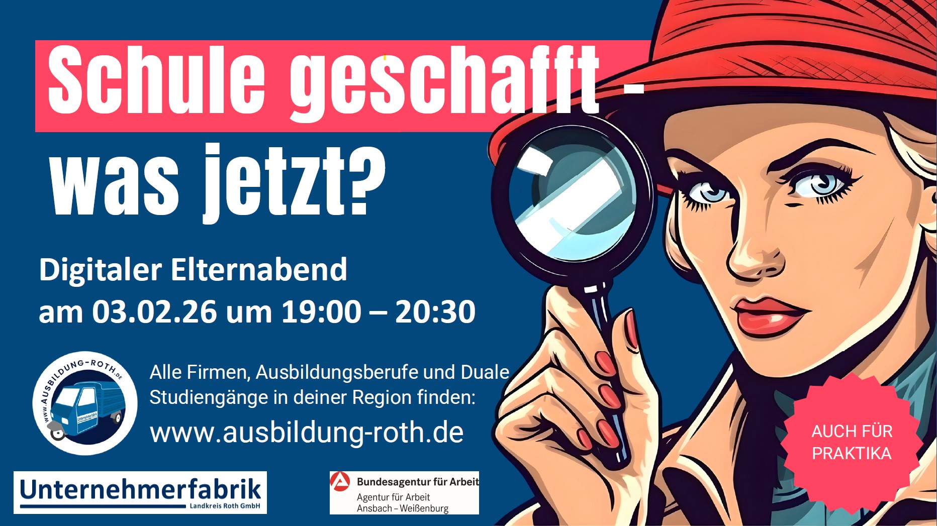 Dieser digitale Elternabend von 19:00- ca. 20:30 informiert Eltern der Vorabschluss-und Abschlussklassen aller Schulen. Wege in Berufe mit sehr guten Zukunftsaussichten und sinnstiftenden Tätigkeiten, sowie praxisorientierte Wege werden aufgezeigt. Wie ein guter Start gelingen kann und welche Vorteile die Jugendlichen haben, darüber informieren wir mit der Berufsberatung der Agentur für Arbeit Ansbach-Weißenburg. Wir zeigen vor allem auch die Möglichkeiten in der Region auf. Zudem gibt es Einblicke in die Praxis: Karrierestarter/-innen berichten, wie sie ihren Berufseinstieg gemeistert haben. Danach werden Fragen beantwortet, welche die Teilnehmer und Teilnehmerinnen bereits während der Vorträge im Chat stellen können.